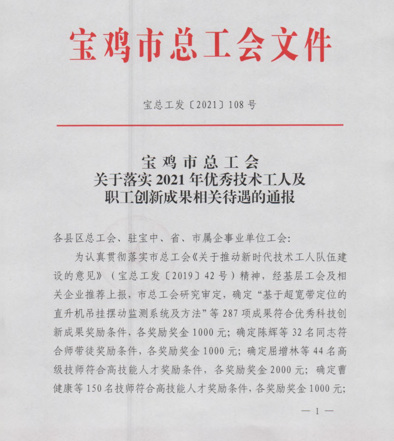 近日,從寶雞市總工會傳來喜訊,寶光股份9項職工科技創新成果榮獲“寶雞市優秀科技創新成果獎”。