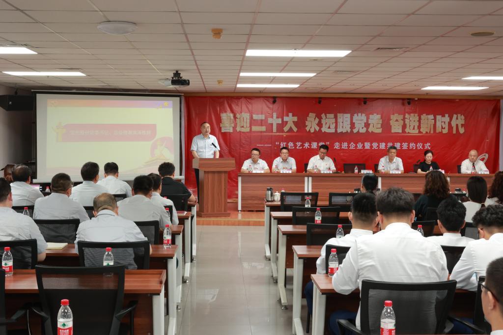 謝洪濤對各位領導、嘉賓的到來表示誠摯歡迎,他指出,學校在人才培養、經營管理、技術研究等方面給公司提供了無私支持,此次“紅色藝術課堂”進企業進一步激發了干部職工崇高的愛黨愛國情懷,雙方凝聚共識、結對共建、簽約揭牌,將開啟校企黨建聯建共建新紀元,掀開校企黨建結對共建、資源共享、優勢互補、共同提高的新篇章。為此,他提出三點希望:一是要充分認識結對共建的重要意義,提高站位,增強責任感、緊迫感和使命感,圍繞校企高質量發展,強強聯合,共同提高,努力建設校企黨建聯建共建的窗口和示范基地;二是要充分發揮結對共建的資源優勢,通過多種方式借鑒好方法好經驗,實現黨建與生產經營、黨建與學校發展工作良性融合發展,實現雙方共贏;三是要充分彰顯結對共建的時代價值,持之以恒推進落實黨建共建基地工作規劃,營造濃厚的共建工作氛圍,按工作計劃扎實有效開展各項聯建共建活動。