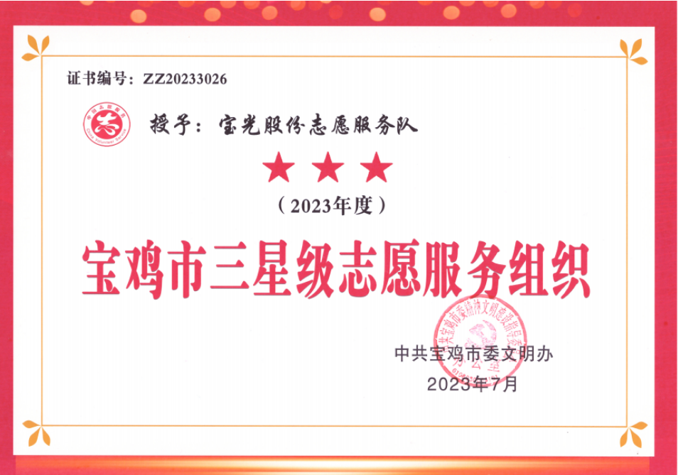 日前,寶光股份志愿服務(wù)隊被中共寶雞市委文明辦評為“寶雞市三星級志愿服務(wù)組織”。
