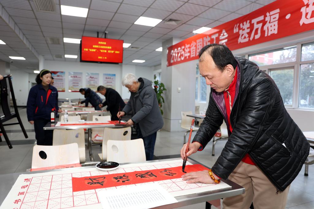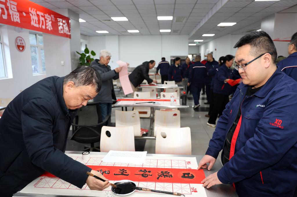 在送春聯(lián)現(xiàn)場(chǎng),書(shū)法家們揮毫潑墨、筆走龍蛇,聞?dòng)嵍鴣?lái)的職工紛紛圍在書(shū)桌旁期待成品。一停一頓、一起一落,一句句散發(fā)著清新墨香的吉祥語(yǔ)句躍然紙上,“一元二氣三陽(yáng)泰,四時(shí)五福六合春”“春滿乾坤千里秀,時(shí)逢盛世萬(wàn)家興”,一副副滿載美好祝福的春聯(lián)和“?!弊周S然紙上,既有辭舊迎新的熱切祈盼,也有對(duì)幸福生活的美好祝福。職工們拿到寫(xiě)滿祝福和美好祝愿的春聯(lián),喜悅之情溢于言表?;顒?dòng)期間共送出春聯(lián)近400余幅,福字300余幅。