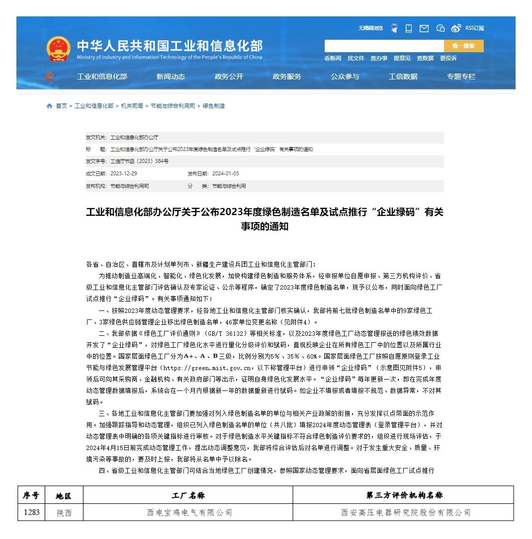 近期,國家工業和信息化部公示2023年度綠色工廠名單,中國西電集團所屬西電寶雞電氣成功入選。